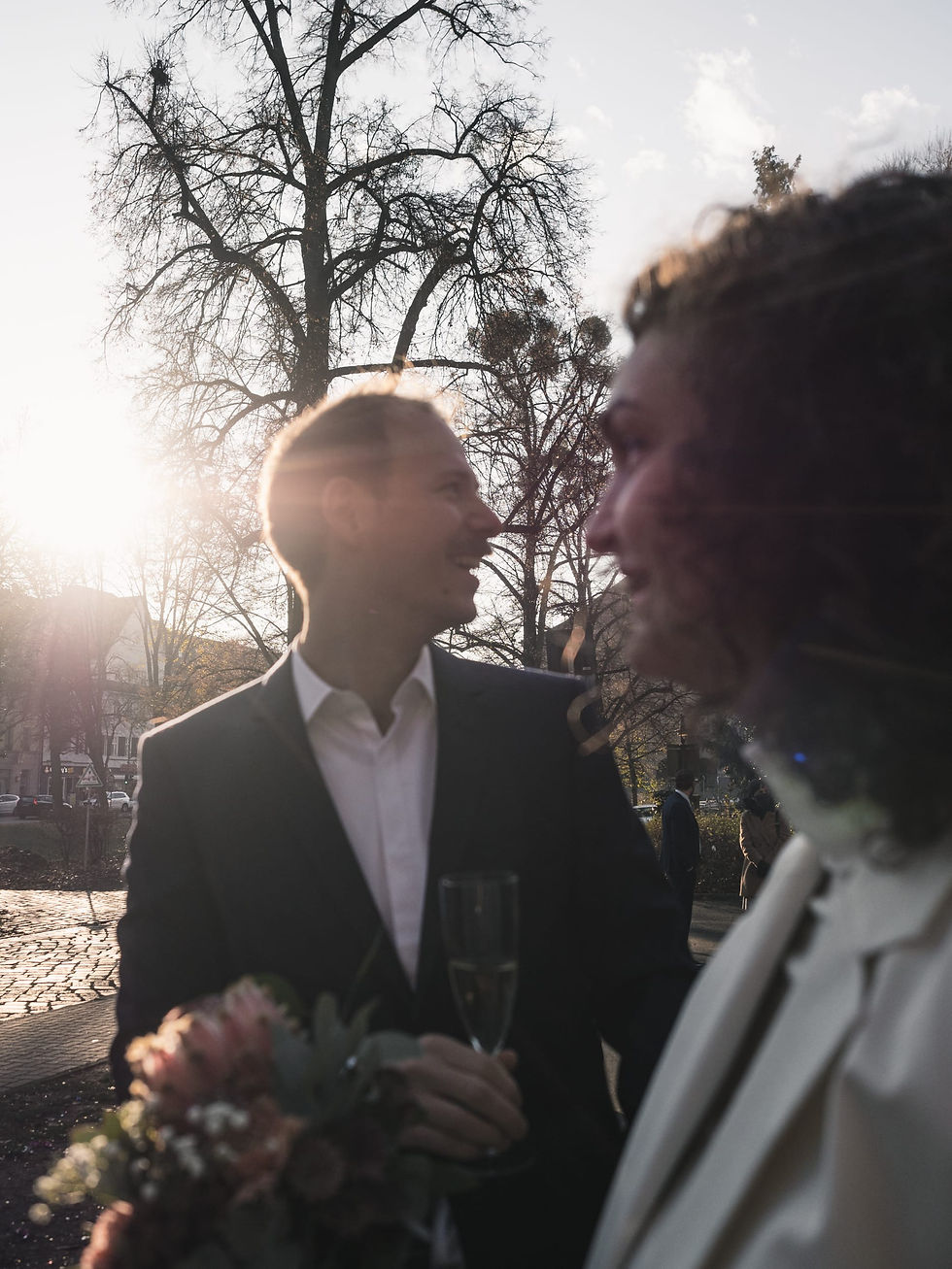 And as they arrive at Helmholtzplatz, their friends surprise them with a spontaneous outside wedding party, complete with balloons, decorations, and a welcoming song. The good spirits of the day continue long into the night, as the newlyweds and their guests enjoy Glühwein and delicious Arancini from their favorite Italian restaurant. And as the helium balloons lose their buoyancy, they are given a second purpose, adding to the fun and laughter of the evening. All in all, it's a beautiful, emotional, and unforgettable day, one that Ramona and Casi will cherish for a lifetime.